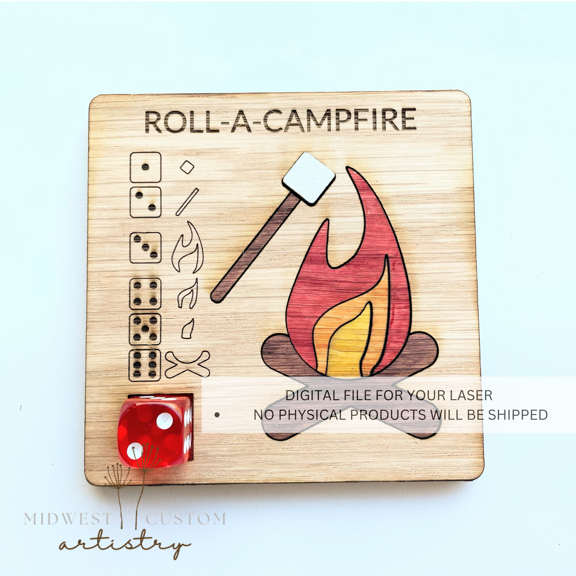 Easily create a fun and interactive game with our Roll-A-Campfire SVG File. This digital file is compatible with laser cutters and vinyl cutters, making it convenient and versatile. The perfect game to play when sitting in your camper on rainy days